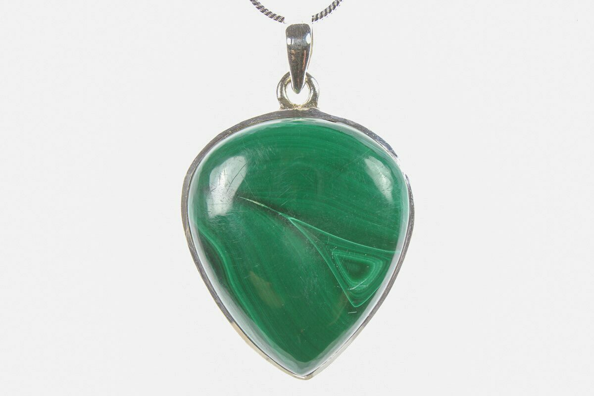 This is a vibrant, green malachite pendant set in 925 sterling silver. The pendant itself is 1.35" tall (including loop) and is accompanied by a 24" silver plated snake chain with a lobster clasp.