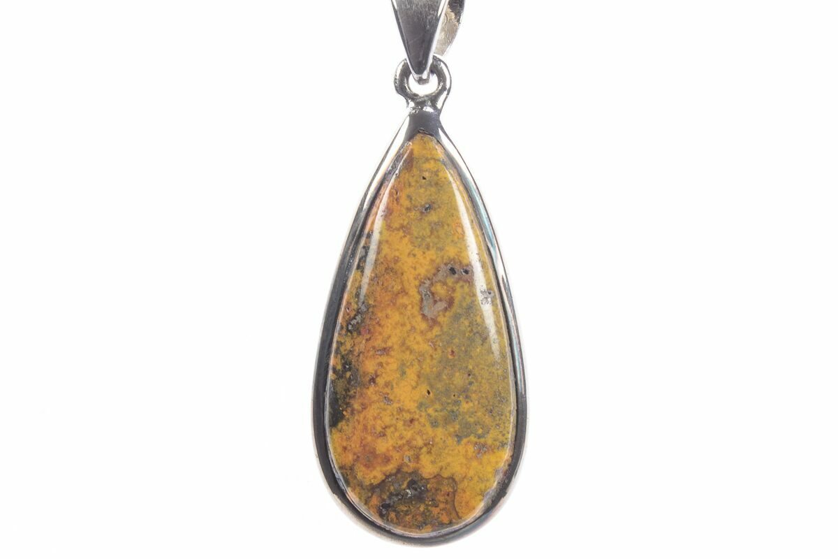 This is a 1.4" tall polished bumblebee jasper pendant set in 925 sterling silver. The material was mined from Mount Papandayan in West Java, Indonesia.