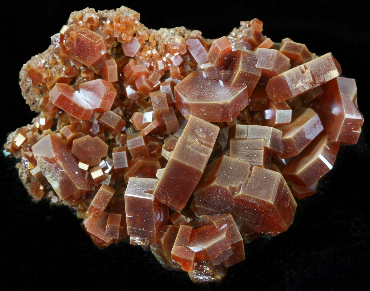 This is a beautiful grouping of large deep red and light brown, vanadinite crystals from Midelt, Morocco. They exhibit excellent color saturation, and a mirror luster on an iron-rich matrix. This specimen is a cluster of hundreds of both small and large, high quality crystals.