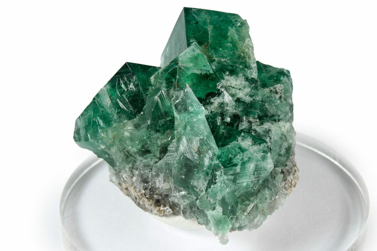 This is a gorgeous, 1.4" wide cubic fluorite twin cluster from the "Greedy Hog Pocket" (intersection of River Catcher Vein and Greenbank Vein) at the Diana Maria Mine in England. This particular kind of fluorite is unique in that it will actually fluoresce a beautiful purple-blue color in just natural light alone! Under short and long wave UV, these crystals fluoresce a vibrant purple color.