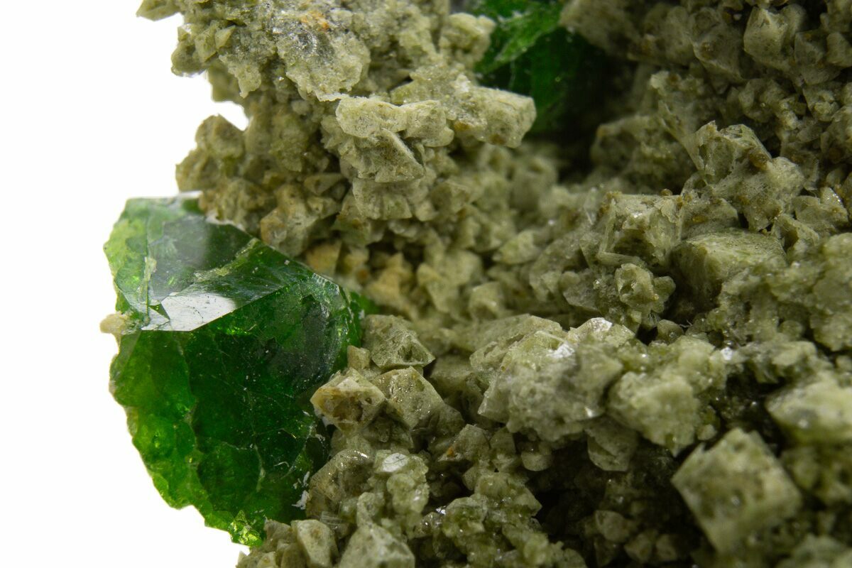 Demantoid is a variety of andradite, which itself is a species of garnet. The chemical composition of demantoid is Ca3Fe2(SiO4)3, with the natural substitution of chromium attributing to the green color of this garnet. Ferric iron is the cause of the yellow in the stone.