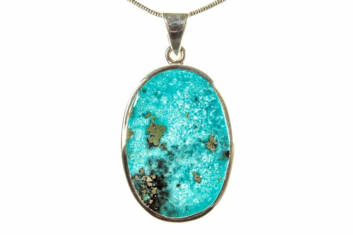 This is a beautiful polished Persian turquoise pendant set in 925 sterling silver. The pendant itself is 1.4" tall (including loop). A 24" silver plated snake chain with a lobster clasp is included with the pendant. You will receive the exact pendant pictured.
