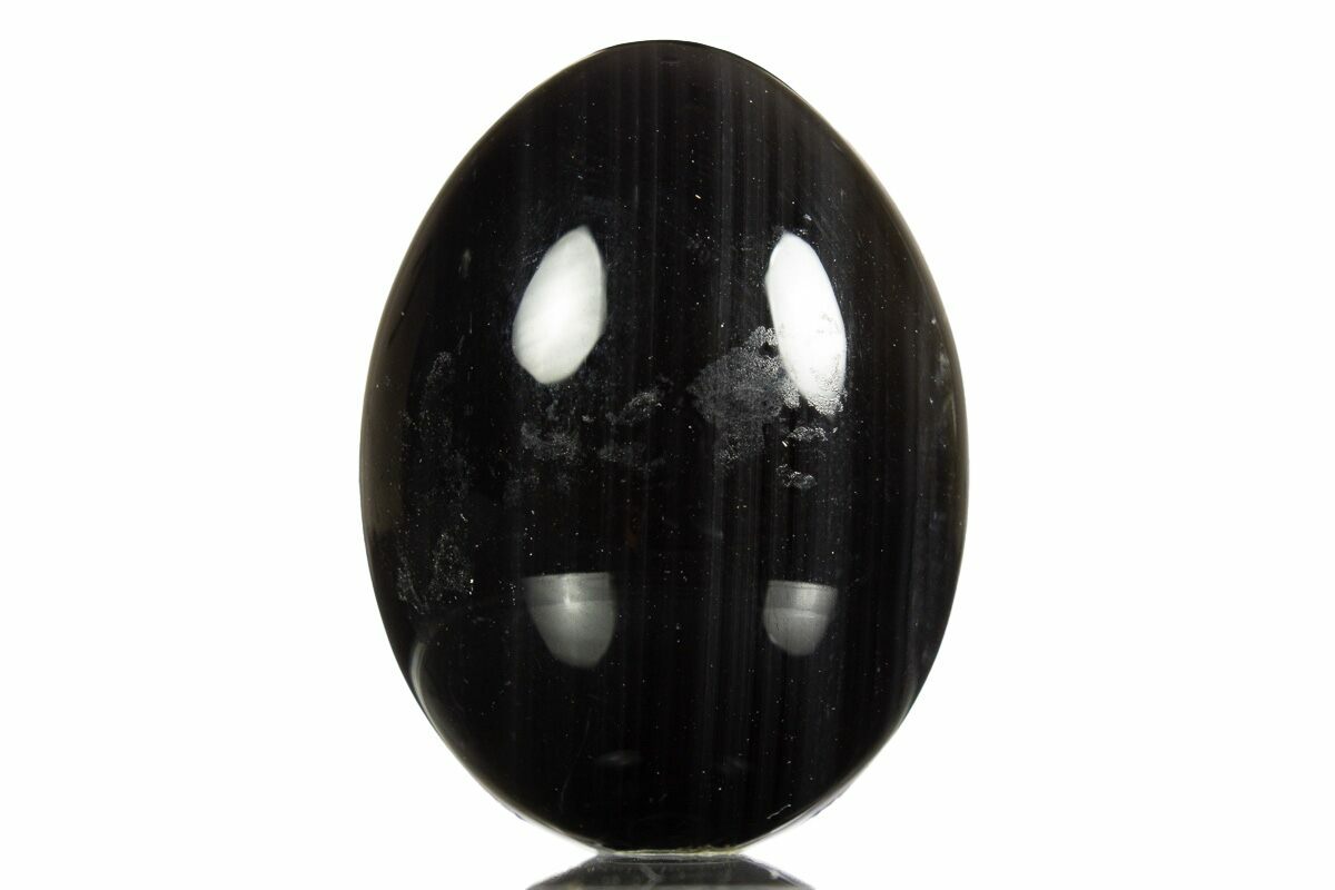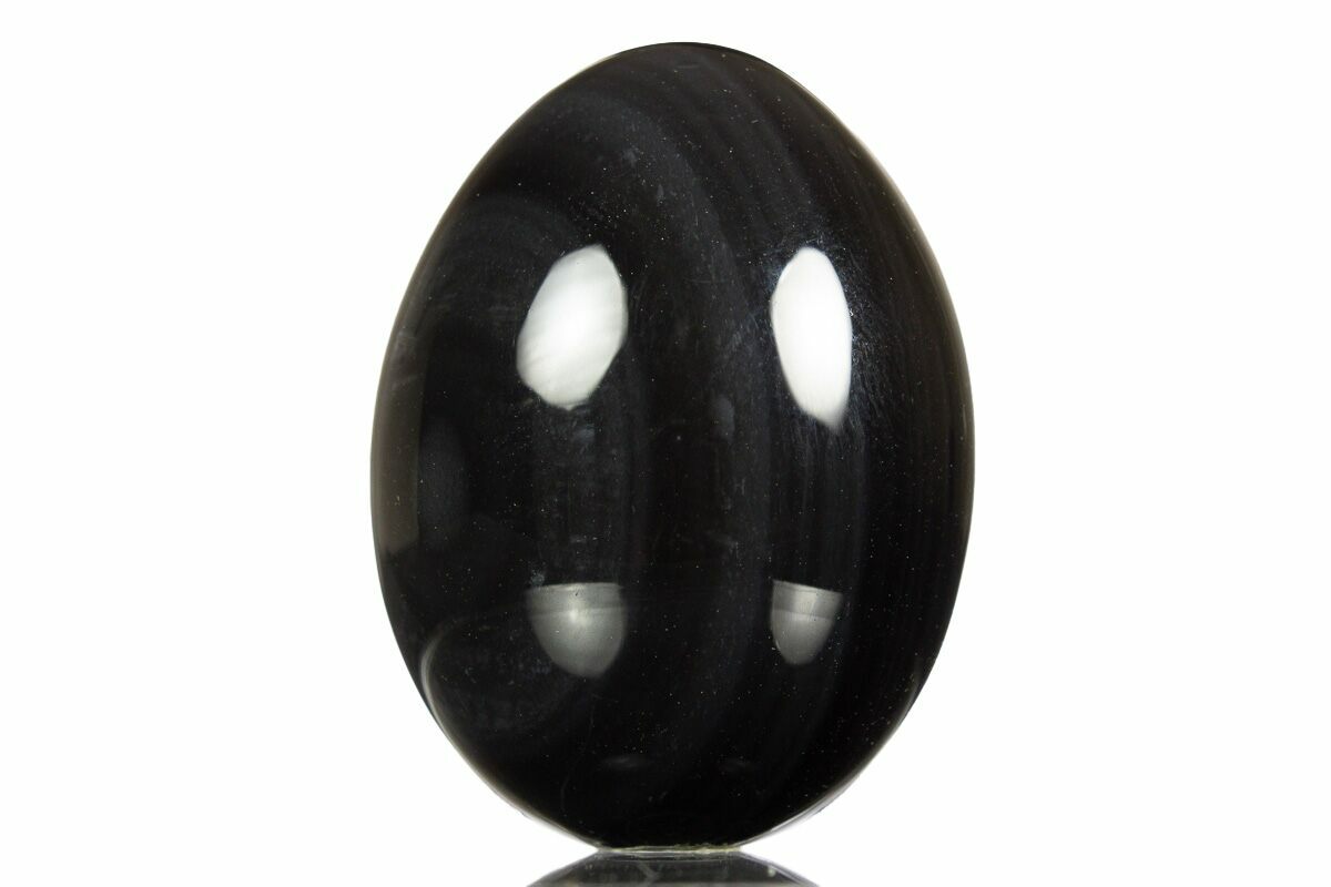 This is a 1.4" tall rainbow obsidian egg. This interesting stone is mined from La Revoltosa Mine near San Andreas, Jalisco, Mexico. The colorful chatoyant bands of the obsidian become apparent when it's placed under a light source.