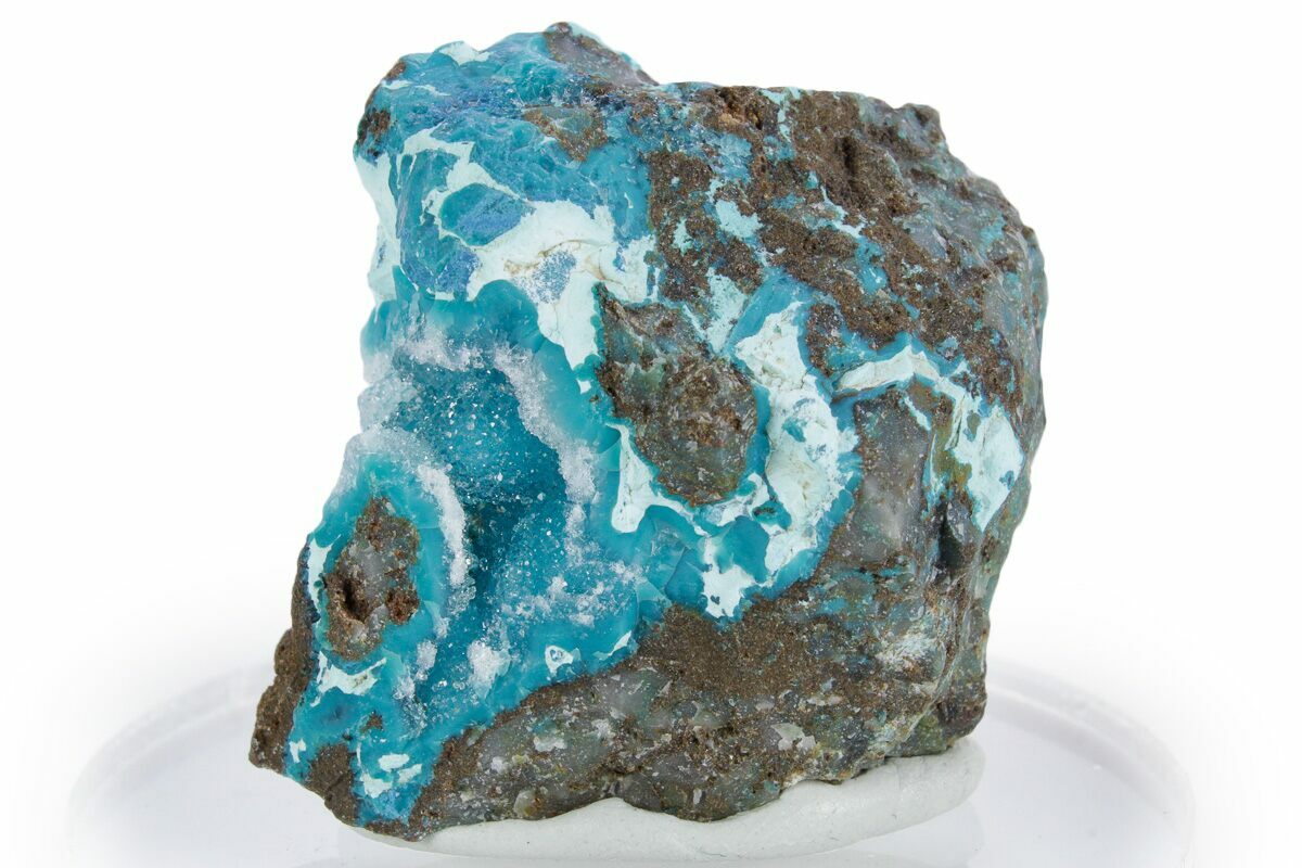 Regularly, chrysocolla will form as botryoidal lumps and spheres, rarely forming visible crystals. It can also form in both solid and fibrous veins, over fibrous minerals, and in crusts. Known for its sharp and vibrant coloring, chrysocolla can display a wide variety of colors such as bluish-green, bright green, light blue, to even sometimes multicolored specimens depending on the atmosphere present during formation.