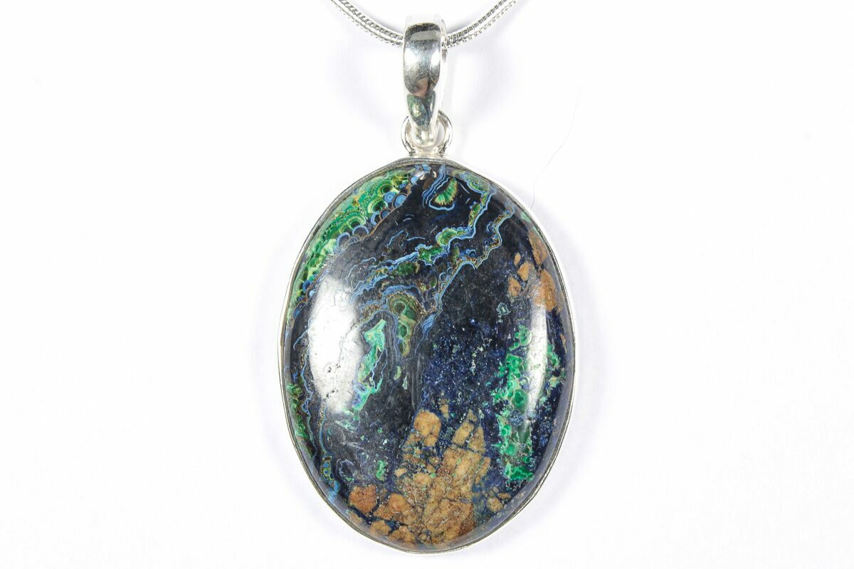 This is a beautiful malachite and azurite pendant set in 925 sterling silver. The pendant itself is 1.4" tall. A 24" silver plated chain with a lobster clasp is included with the pendant. You will receive the exact pendant pictured.