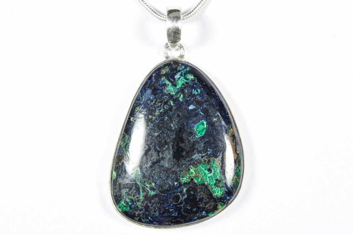 This is a beautiful malachite and azurite pendant set in 925 sterling silver. The pendant itself is 1.4" tall. A 24" silver plated chain with a lobster clasp is included with the pendant. You will receive the exact pendant pictured.