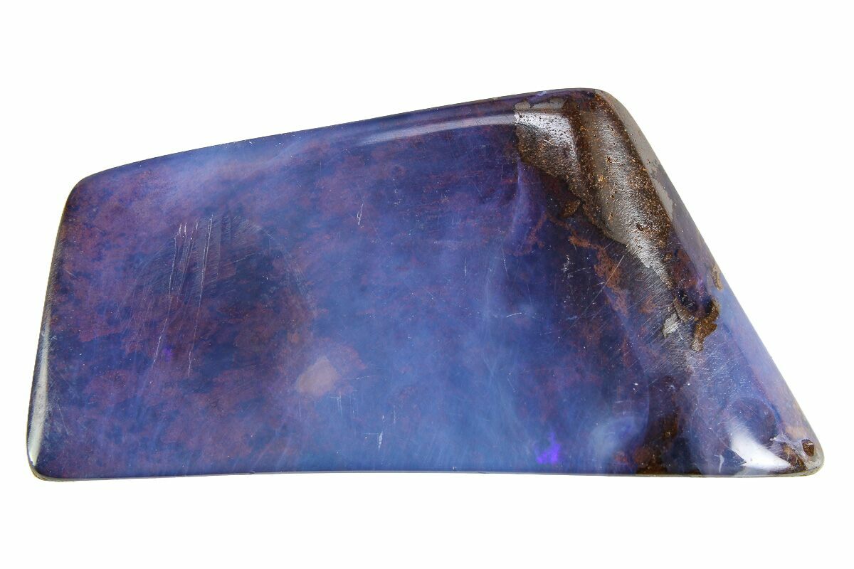 This is a 1.40" wide polished boulder opal specimen from Queensland, Australia. This piece shows off electric purple-blue opal with a vibrant red flash near its center. A truly singular specimen!