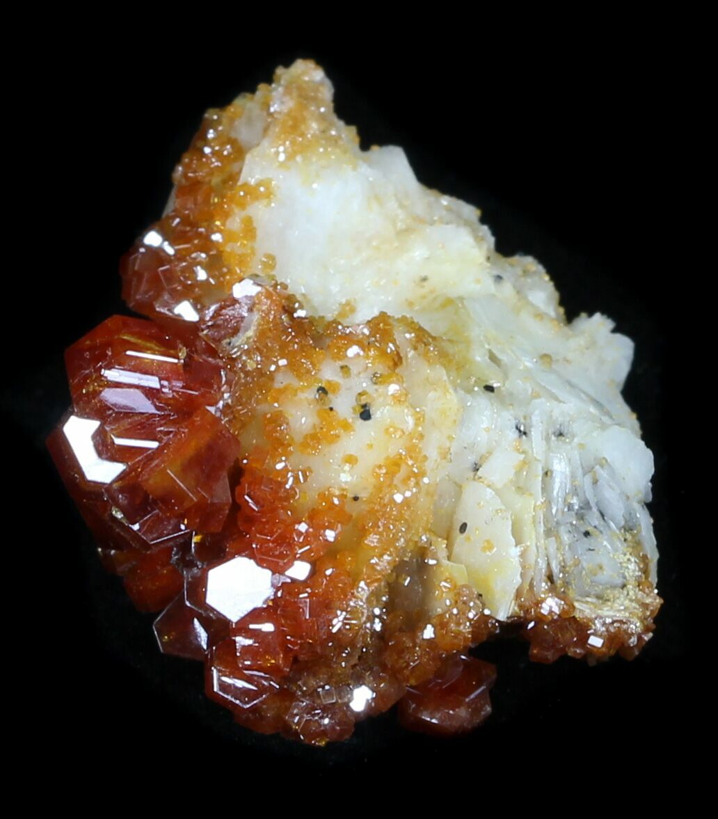 Vanadinite from Morocco is world-famous for producing some of the finest red crystal specimens on the planet. In the arid hills surrounding Mibladen and Taouz, vanadinite forms as vibrant clusters of hexagonal prisms, often with a deep crimson to orange-red color that seems to glow against the pale desert matrix. These crystals typically develop in dense groups, coating barite blades or covering weathered limestone with dazzling, glassy faces and sharp geometric symmetry. The dryness of the region and the slow oxidation of ancient lead deposits create the perfect geochemical environment for vanadinite to grow with exceptional clarity, luster, and intensity of color. Moroccan vanadinite is highly prized by collectors for its bold aesthetics, architectural crystal formations, and the consistent quality that has made these localities the global benchmark for the species.