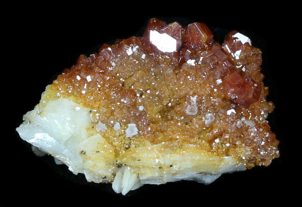 This is a beautiful grouping of deep red, vanadinite crystals from Midelt, Morocco. They exhibit excellent color saturation, and a mirror luster on a matrix of barite. This specimen has a cluster of many of small, well defined crystals and measures 1.41x1.13"