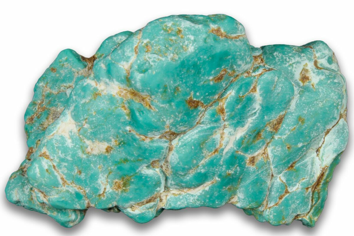 Turquoise is a prized gemstone known for its captivating shades of blue to green, formed through the interaction of copper, aluminum, and phosphate in arid, mineral-rich environments. Throughout history, it has been valued by many cultures for its beauty and rarity. Chilean turquoise, though less widely known than material from regions like the American Southwest or Iran, offers its own distinctive appeal. It is primarily mined in northern Chile, particularly in the Atacama Desert near cities like Copiapó and Ovalle, where copper mining is abundant. This turquoise often exhibits vivid blue to blue-green tones, frequently accented by striking veins of brown, black, or golden matrix. Its bold coloration and earthy character make Chilean turquoise a unique and sought-after variety among collectors and jewelry artisans alike.
