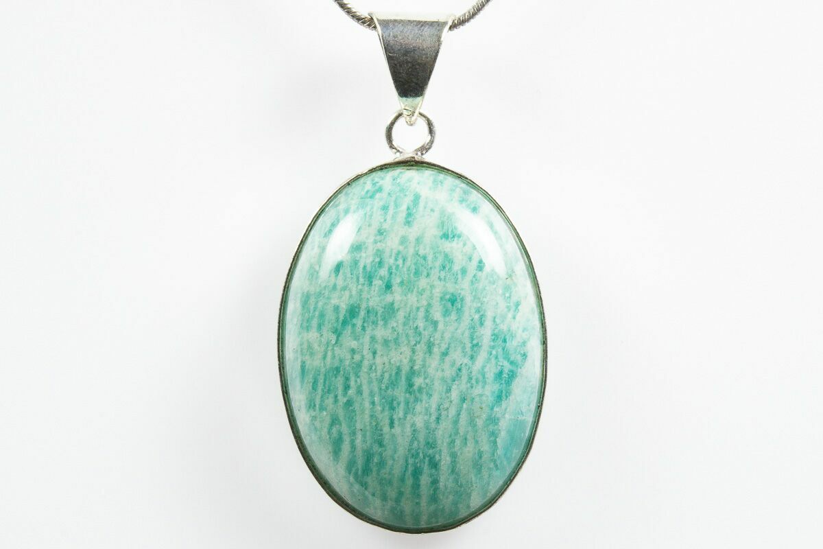 This is a alluring amazonite pendant featuring a beautiful, polished amazonite stone. The pendant itself is 1.45" tall (including loop). A 24" silver plated chain with a lobster clasp is included with the pendant. You will receive the exact pendant pictured.