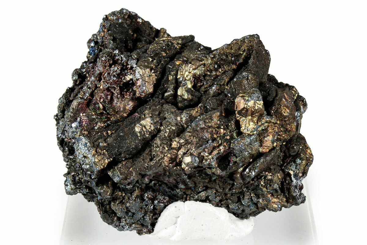 This is a 1.45" tall cluster of iridescent chalcocite crystals, collected from Flambeau Mine in Wisconsin. It has been mounted to an acrylic display base with mineral tack.
