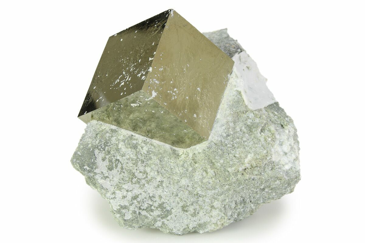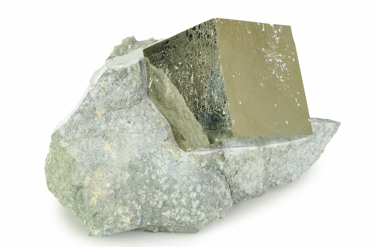 This is a shining cube of pyrite that's still embedded within its matrix from the famous Victoria Mine near Navajun, Spain. The pyrite has a wonderful, golden metallic luster and is quite large at 1.46" across. It does have a lot of natural pitting with host rock embedded in it, hence the bargain price.