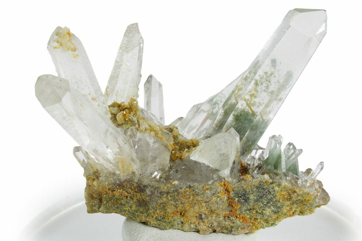 This is a 1.5" wide cluster of glassy quartz crystals with what appears to be mica aggregations, collected in Peru. I suspect this is a new find as there is very little information on the specific deposit it came out of. The green color of the quartz can be attributed to chlorite inclusions. This specimen has been mounted with mineral tack for museum-quality display.
