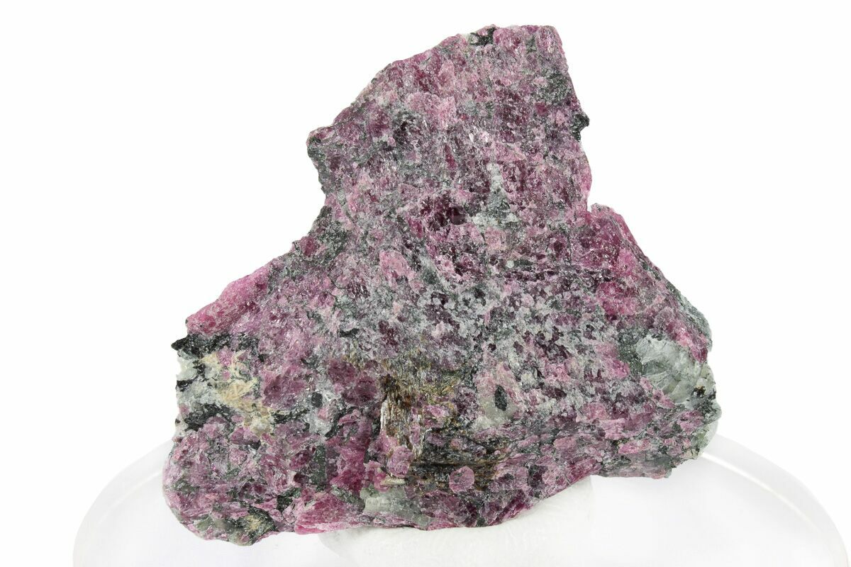 This is a section of rough, purple/magenta eudialyte collected from Kirovskii (Kirovsky) Mine on Kukisvumchorr Mountain in Russia. It has been mounted to an acrylic display base with mineral tack.