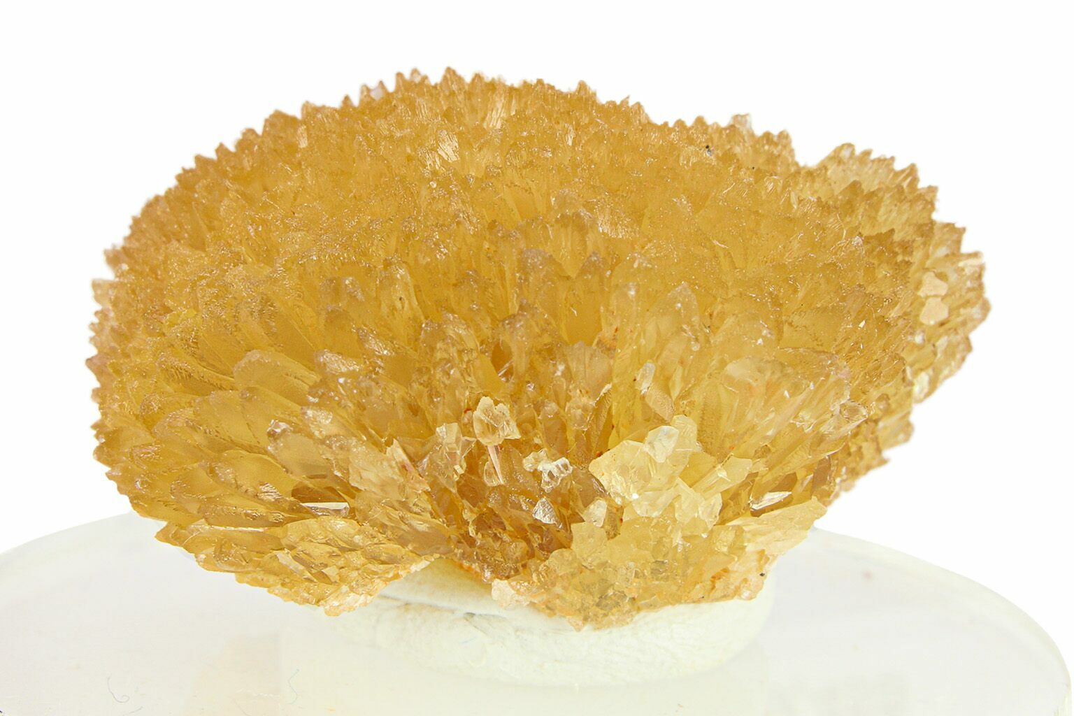 This is a cluster of tightly packed, botryoidal-looking, wonderfully translucent yellow-orange calcite collected from Morocco. The cluster measures 1.5" at its widest point. Under shortwave ultraviolet light, the calcite crystals exhibit a vibrant blue-white fluorescence. The fluorescence is a faint greenish under longwave ultraviolet light as well, but it's not nearly as intense.