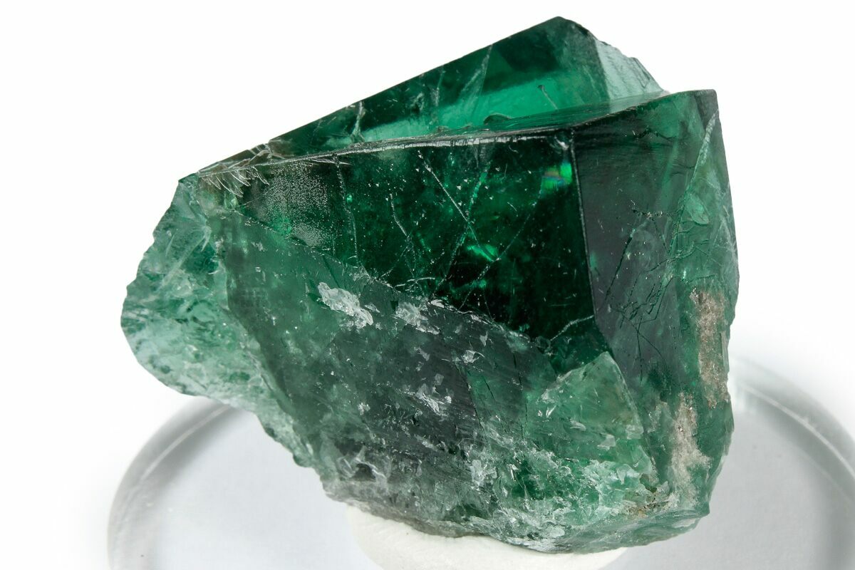 This is a gorgeous, 1.5" wide cubic fluorite twin cluster from the "Greedy Hog Pocket" (intersection of River Catcher Vein and Greenbank Vein) at the Diana Maria Mine in England. This particular kind of fluorite is unique in that it will actually fluoresce a beautiful purple-blue color in just natural light alone! Under short and long wave UV, these crystals fluoresce a vibrant purple color.