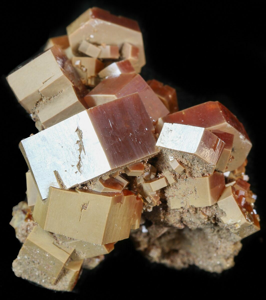 This is a beautiful grouping of huge, deep red to light brown, vanadinite crystals from Midelt, Morocco. They exhibit excellent color saturation, and a mirror luster on an iron-rich matrix. This specimen is a cluster of large, high quality crystals.