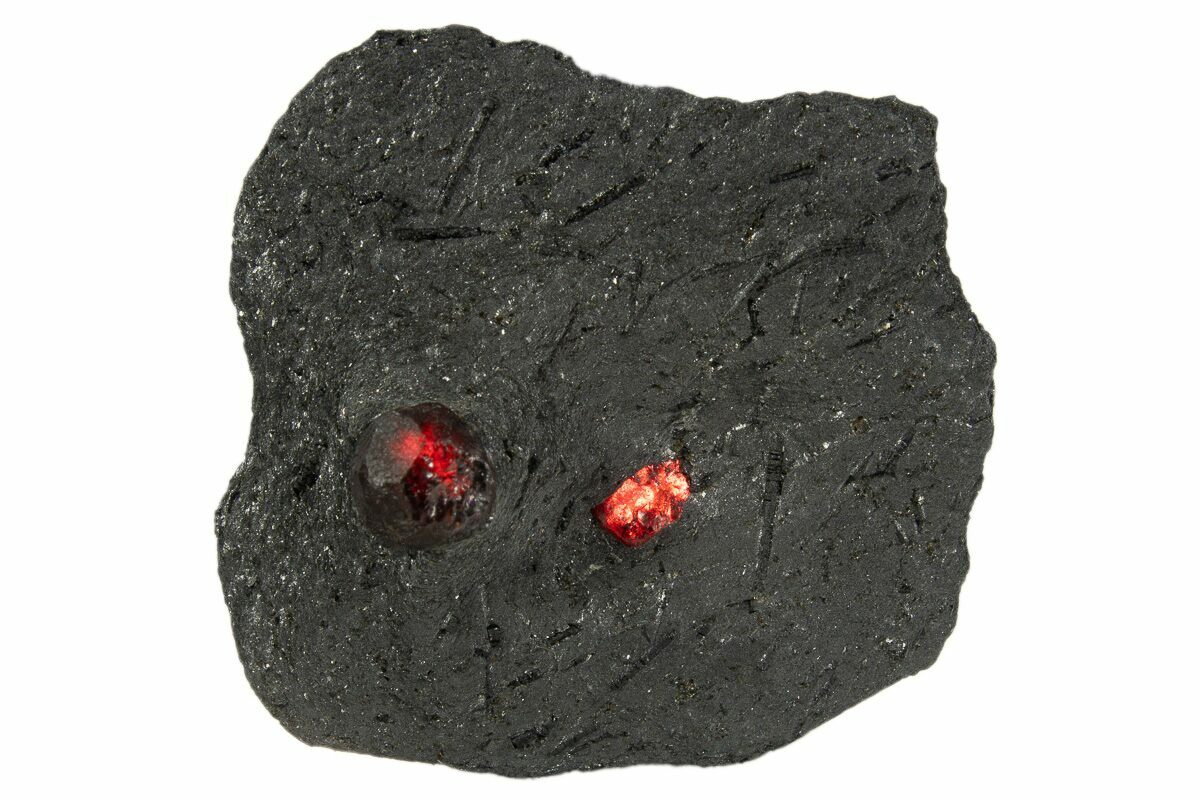 These are two almandine garnets in a 1.5" wide graphite matrix, collected from the Red Embers Mine near Erving, Massachusetts. The graphite matrix has been worked to expose all of the garnets from both sides of the rock. This type of prep allows the garnets to glow a fiery red when placing a light source behind the specimen. The graphite matrix is peppered with black dravite crystals.