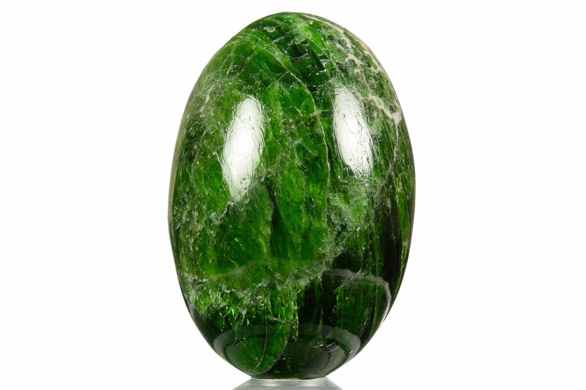 This is a 1.5" long specimen of vibrant green chrome diopside collected from the mountains of Yakutia, Russia. It has been shaped into an ellipsoid and flawlessly polished to a glossy finish.