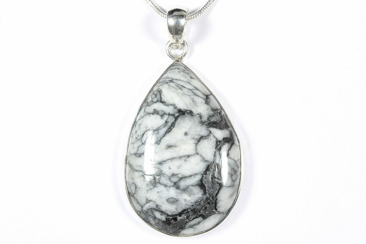 This is a polished Pinolite stone from Austria that has been set in 925 sterling silver. The pendant measures 1.5" tall (including loop) and showcases the stone's signature white magnesite “pine-nut” patterns set against a deep gray dolomite matrix. A 24" silver plated snake chain with a lobster clasp is included with the pendant. You will receive the exact pendant pictured.