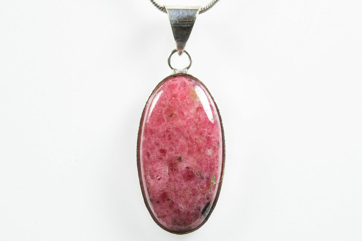 This vibrant rhodonite pendant showcases a brilliantly colored pink stone polished to a smooth, glossy finish. The pendant measures 1.5" tall and makes a bold, elegant statement. It comes complete with a 24" silver-plated chain with a lobster clasp.
