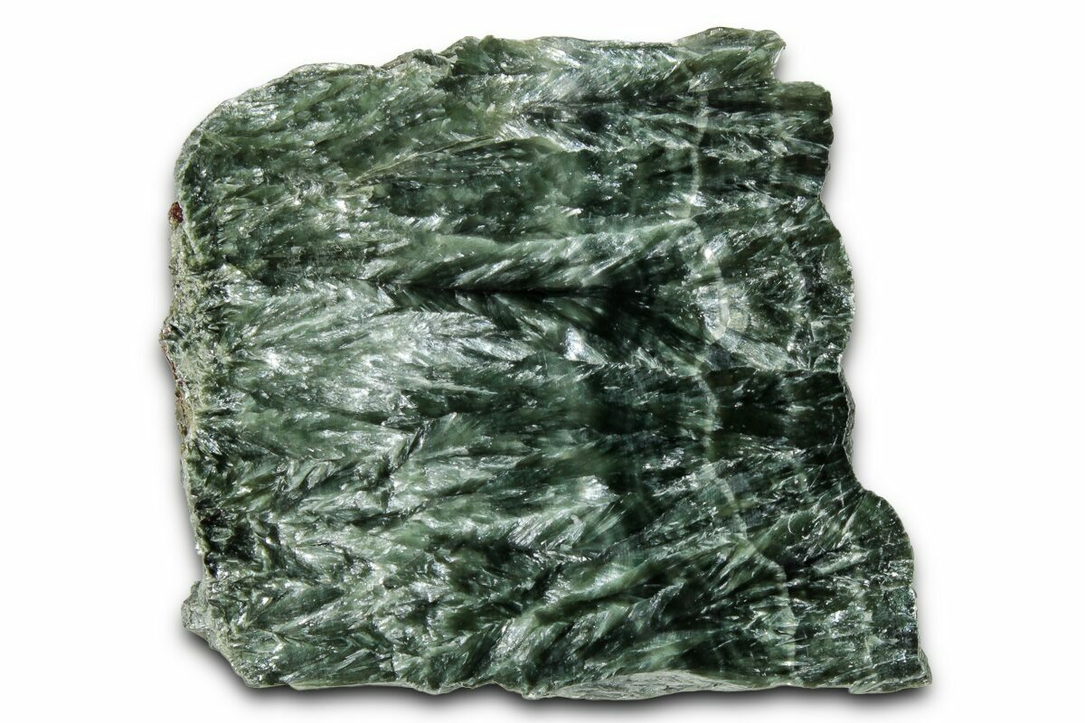 This is a cross-sectional cut slab of spherical seraphinite aggregations, collected from the Korshunovkiy mine (Korshunovskoye Iron Skarn) in Siberia, Russia. It has been polished to a glossy finish on one side, revealing the chatoyant nature of this stunning mineral.