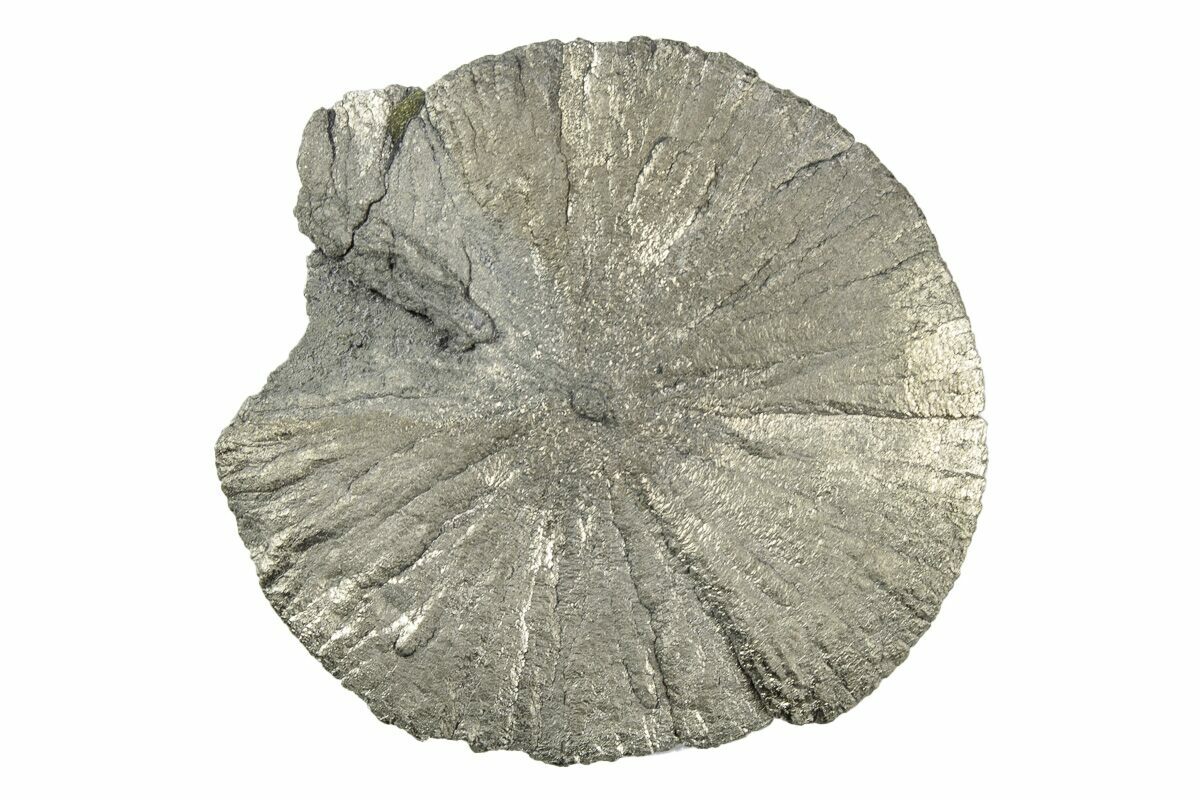 Pyrite suns or pyrite dollars are an unusual pyrite formation: striations radiate out from the center like rays of the sun. They are found in narrow, compacted seams of slate interbedded in the 300 million-year-old coal deposits near Sparta, Illinois. They are recovered as a byproduct of local coal mining operations, but are increasingly difficult to source as the coal mines in Illinois shut down one by one.