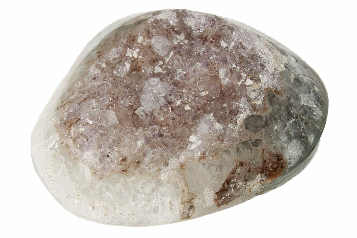 This is a section of a quartz crystal geode that has been cut along the edges and back, and polished to a glossy-finish. This cabochon would make for a good large pendant or center piece on a necklace. This druzy quartz was collected from the famed amethyst mines of Artigas, Uruguay.