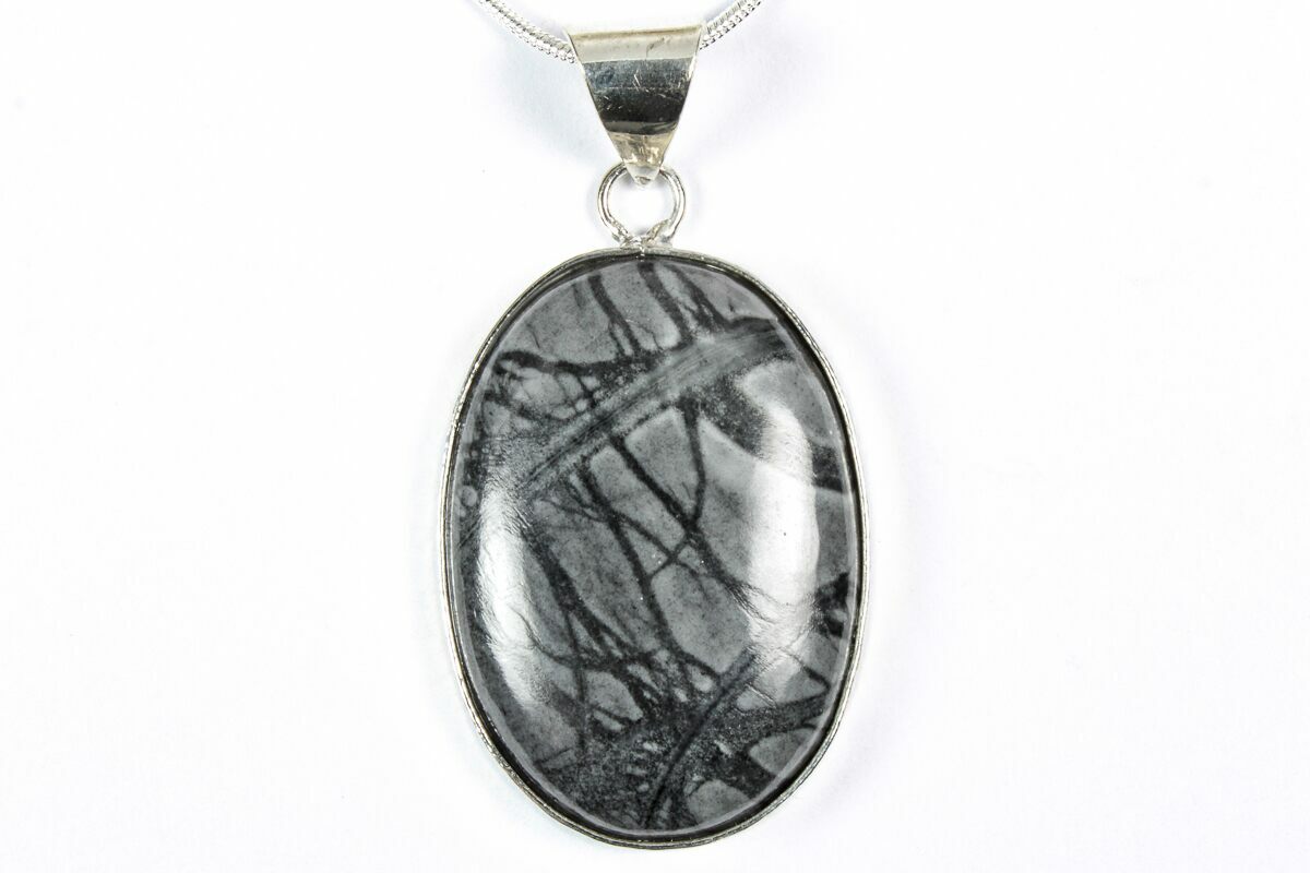 This 1.55" tall pendant (measured including the loop) is hand-crafted from natural Utah Picasso Marble, a decorative stone known for its bold, abstract veining and earthy tones. The pendant comes ready to wear on a 24-inch silver-plated snake chain, finished with a lobster clasp.