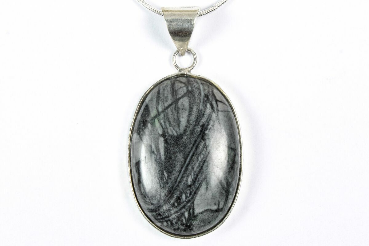 This 1.55" tall pendant (measured including the loop) is hand-crafted from natural Utah Picasso Marble, a decorative stone known for its bold, abstract veining and earthy tones. The pendant comes ready to wear on a 24-inch silver-plated snake chain, finished with a lobster clasp.
