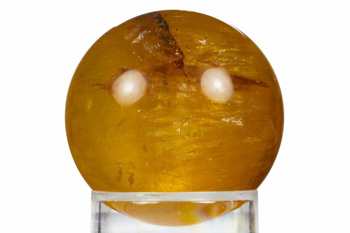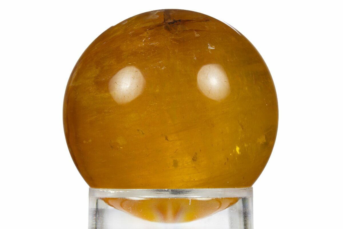This is a beautiful, 1.6" wide polished sphere made out of yellow/orange fluorite, mined in China. The quality of the polishing is excellent. Under short wave UV light, the crystals exhibit a white fluorescence. Comes with the pictured display stand.