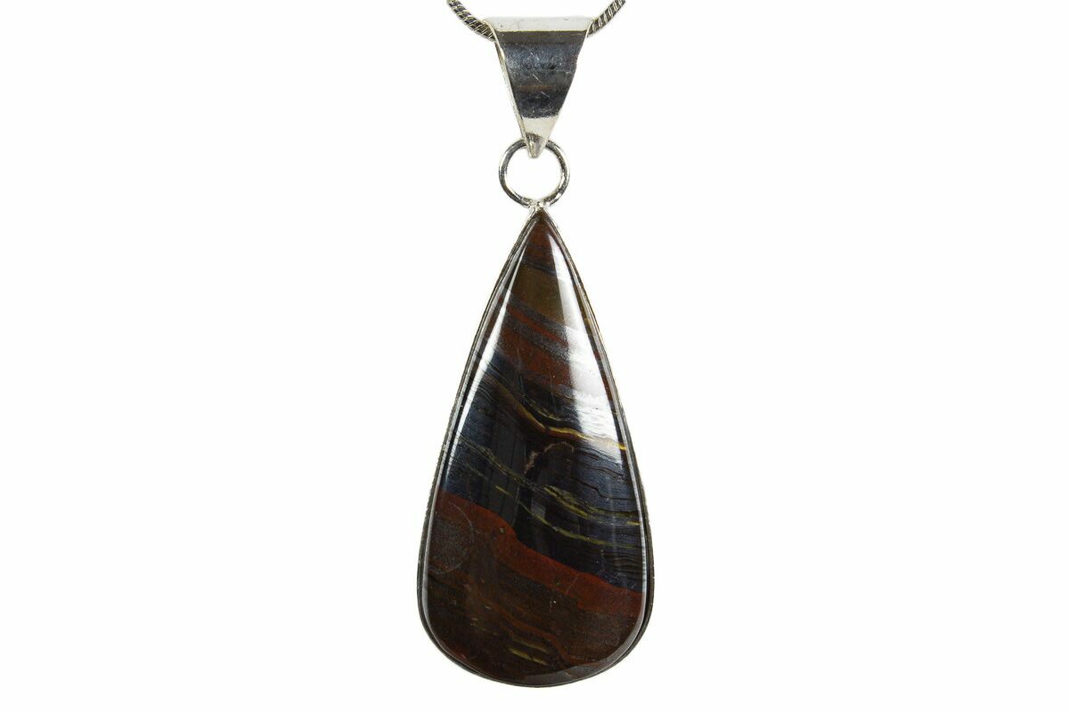 This is a stunning, 1.6" tall (including loop) pendant crafted from ancient tiger iron dating back approximately 3.02 billion years, collected from the Ord Ranges of Western Australia. The stone has been carefully shaped and polished to a high-gloss finish, revealing its dramatic bands of golden tiger’s eye, deep red jasper, and dark hematite. A 24" silver-plated snake chain with a lobster clasp is included, making it ready to wear. You will receive the exact pendant pictured.