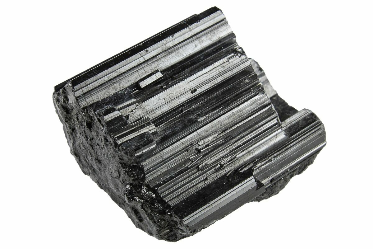 Schorl, also known as "black tourmaline" or "black schorl", is a black form of tourmaline that often occurs as lustrous prismatic crystals. The crystals can be stubby or elongated and typically feature lengthwise striations. Many schorl crystals have flattened pyramidal terminations. They can also form in radiating, columnar, and stalactitic aggregations, as well as small, needle-like inclusions within quartz (tourmalinated quartz) and in massive form.