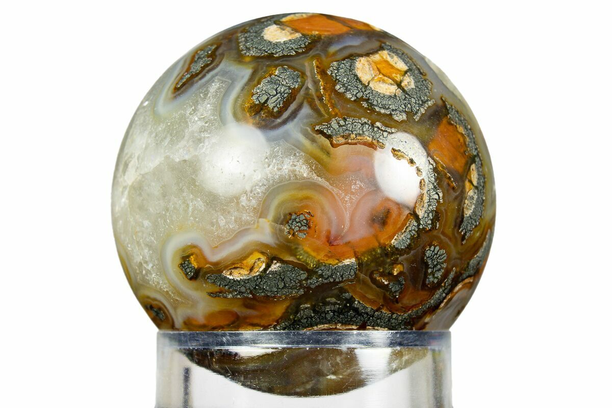 This is a 1.6" wide polished sphere made from Indonesian marcasite agate, collected in Western Java, Indonesia. It has been shaped and flawlessly polished to a glossy finish, and features beautiful formations of lustrous marcasite that are encapsulated in colorful agate.