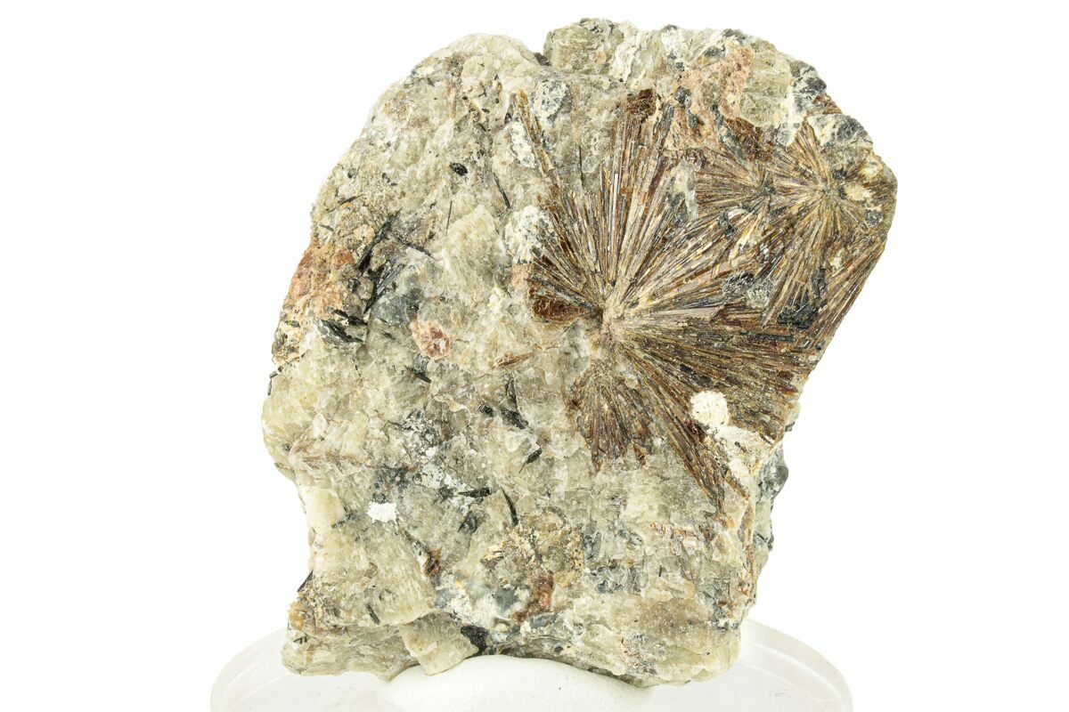 This fantastic specimen features sprays of lamprophyllite crystals in a sodalite matrix. It was collected from Murmansk Oblast, Russia, and is mounted to an acrylic display base with mineral tack.