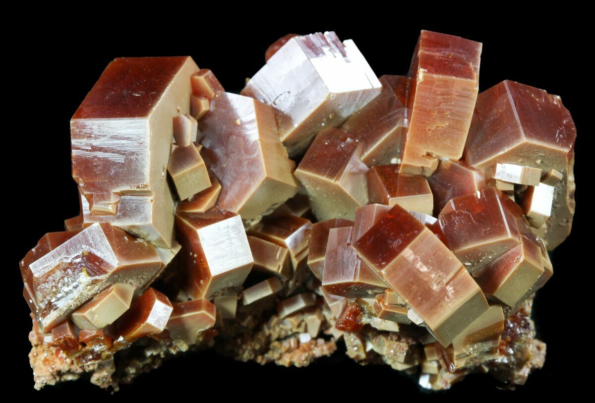 This is a beautiful grouping of large deep red and light brown, vanadinite crystals from Midelt, Morocco. They exhibit excellent color saturation, and a mirror luster on an iron-rich matrix. This specimen is a cluster of hundreds of both small and large, high quality crystals, with minuscule damage to a couple of the crystals.