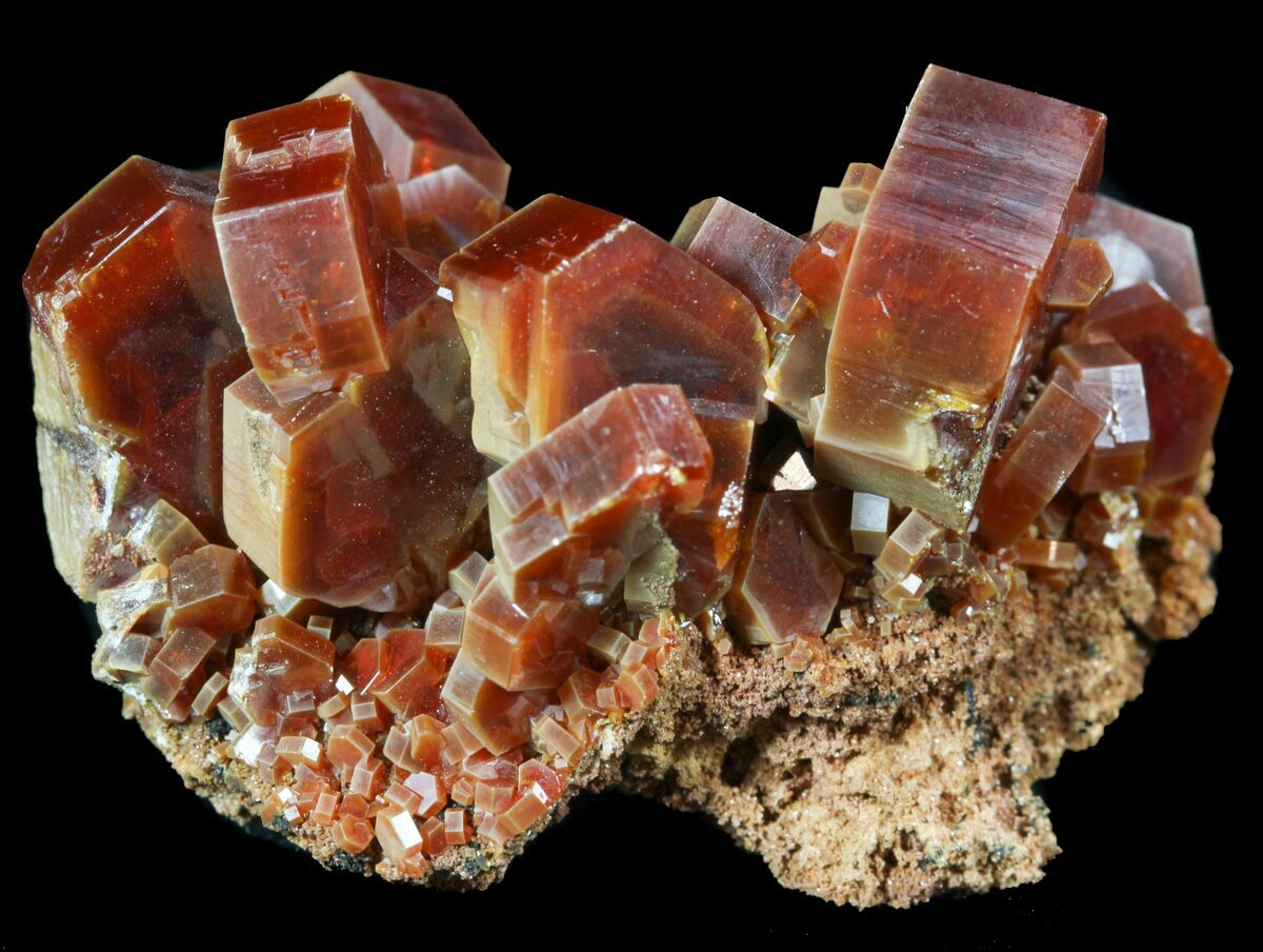 Vanadinite from Morocco is world-famous for producing some of the finest red crystal specimens on the planet. In the arid hills surrounding Mibladen and Taouz, vanadinite forms as vibrant clusters of hexagonal prisms, often with a deep crimson to orange-red color that seems to glow against the pale desert matrix. These crystals typically develop in dense groups, coating barite blades or covering weathered limestone with dazzling, glassy faces and sharp geometric symmetry. The dryness of the region and the slow oxidation of ancient lead deposits create the perfect geochemical environment for vanadinite to grow with exceptional clarity, luster, and intensity of color. Moroccan vanadinite is highly prized by collectors for its bold aesthetics, architectural crystal formations, and the consistent quality that has made these localities the global benchmark for the species.