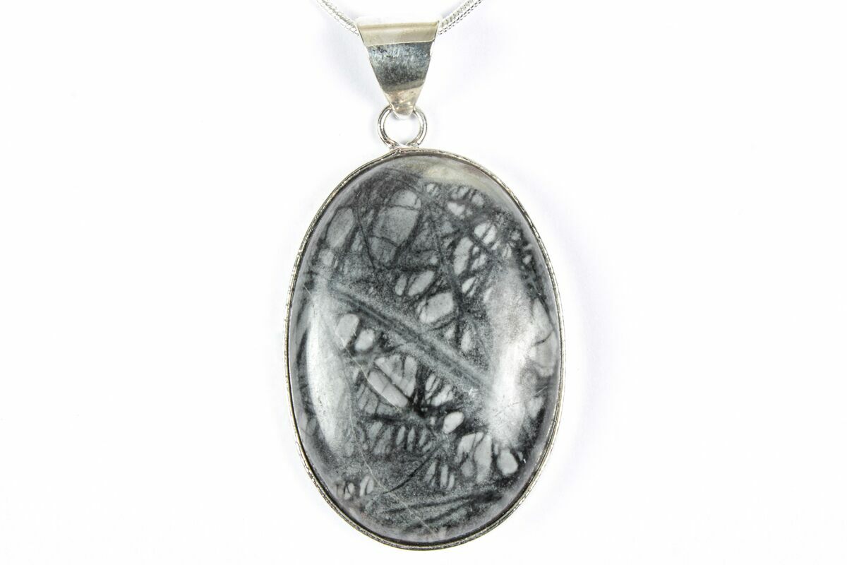 This 1.6" tall pendant (measured including the loop) is hand-crafted from natural Utah Picasso Marble, a decorative stone known for its bold, abstract veining and earthy tones. The pendant comes ready to wear on a 24-inch silver-plated snake chain, finished with a lobster clasp.