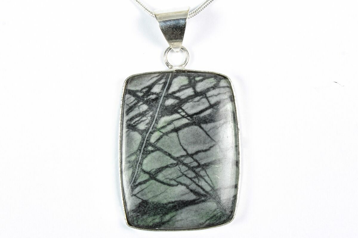 This 1.6" tall pendant (measured including the loop) is hand-crafted from natural Utah Picasso Marble, a decorative stone known for its bold, abstract veining and earthy tones. The pendant comes ready to wear on a 24-inch silver-plated snake chain, finished with a lobster clasp.