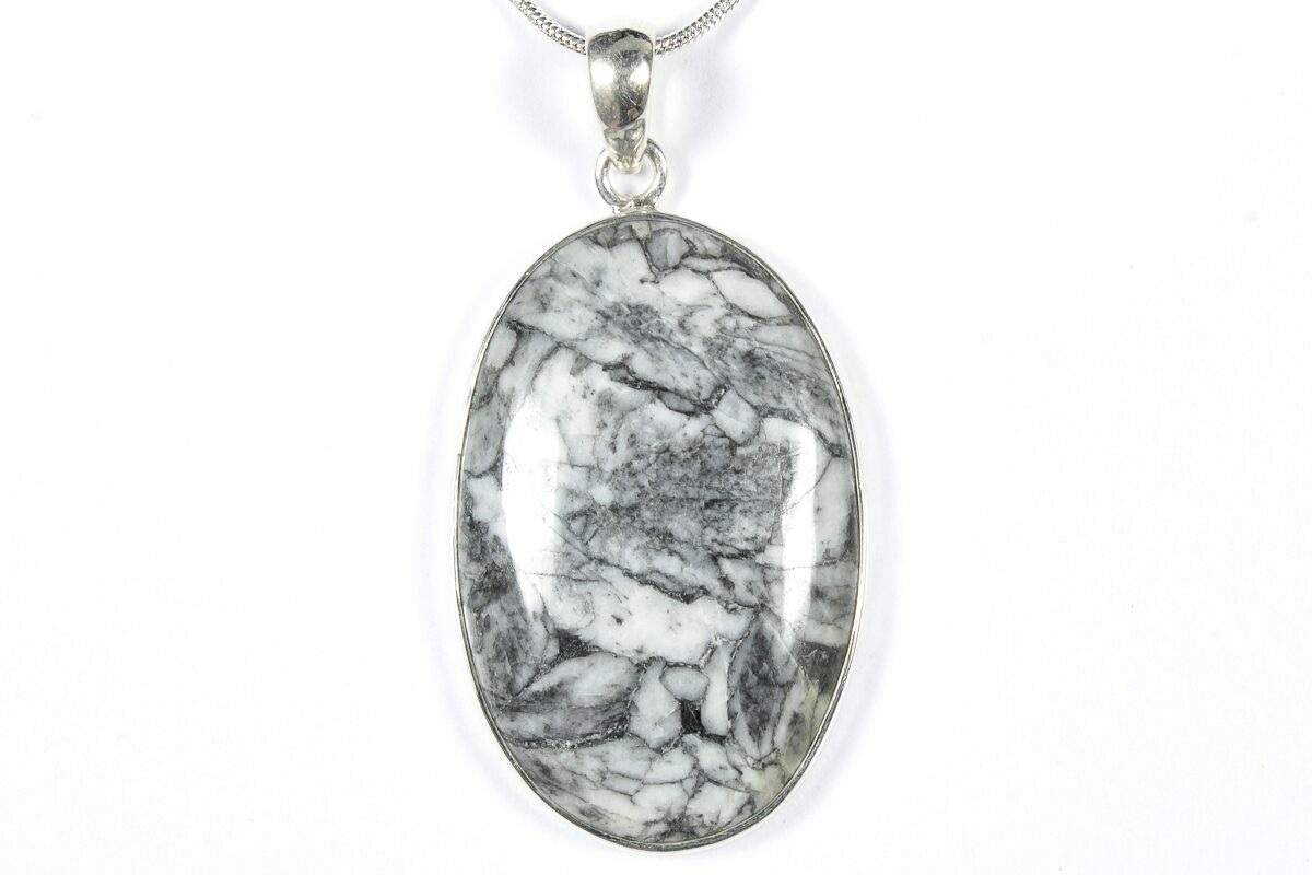 This is a polished Pinolite stone from Austria that has been set in 925 sterling silver. The pendant measures 1.6" tall (including loop) and showcases the stone's signature white magnesite “pine-nut” patterns set against a deep gray dolomite matrix. A 24" silver plated snake chain with a lobster clasp is included with the pendant. You will receive the exact pendant pictured.