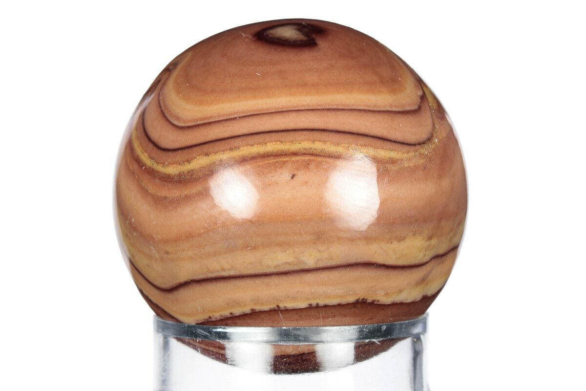 This is a unique 1.6" wide polished Rolling Hills Dolomite sphere, featuring striking natural banded patterns. It’s been expertly shaped and polished to a glossy, reflective finish. It comes with an acrylic ring display stand.