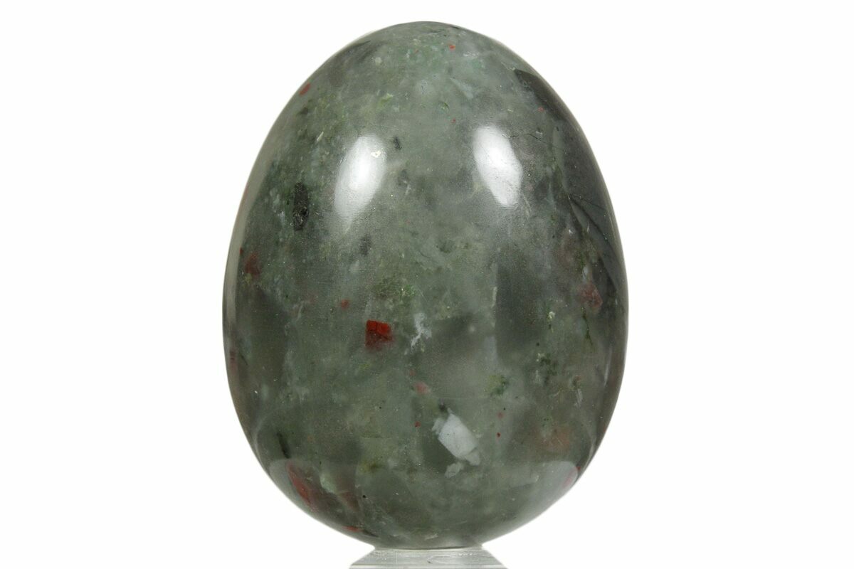 This is a beautiful piece of seftonite (also known as bloodstone and heliotrope) from South Africa that has been polished into an egg shape. This specimen measures 1.6 inches tall and its glossy polish allows the colorful inclusions within the chalcedony to be seen.