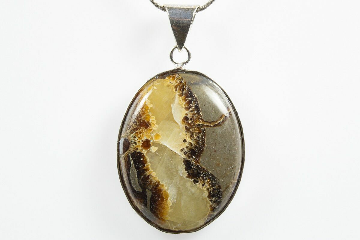 This handcrafted pendant is made from polished Madagascar septarian, showcasing the stone’s natural patterns and earthy tones. Each unique piece comes paired with a 24-inch silver-plated snake chain featuring a lobster clasp.