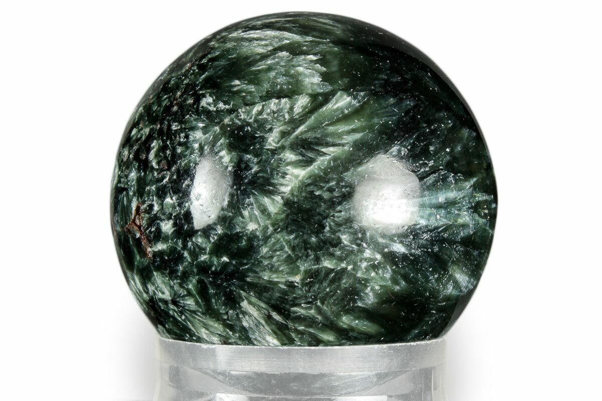 This is a 1.6" wide sphere made from a solid piece of seraphinite, collected from the Korshunovskoye Iron Skarn in Eastern Siberia. This beautiful piece has been highly polished to a glossy-finish and is accompanied by an acrylic ring display stand.