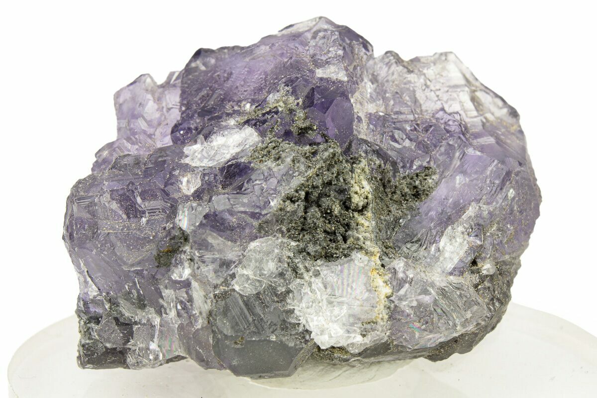 Xia Yang Mine is a mine in central China's Fujian province that produces rich, dark fluorite specimens along with calcite and quartz. The flourite from this locality tends to be blocky in shape with large faces, and can come in a range of colors from vibrant blues to deeper purples and glassy green shades. The deep purple specimens are sometimes called "Tanzanite Fluorites" for the rich, deep blue-purple coloration and the way those colors shift depending on the lighting.