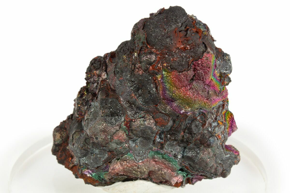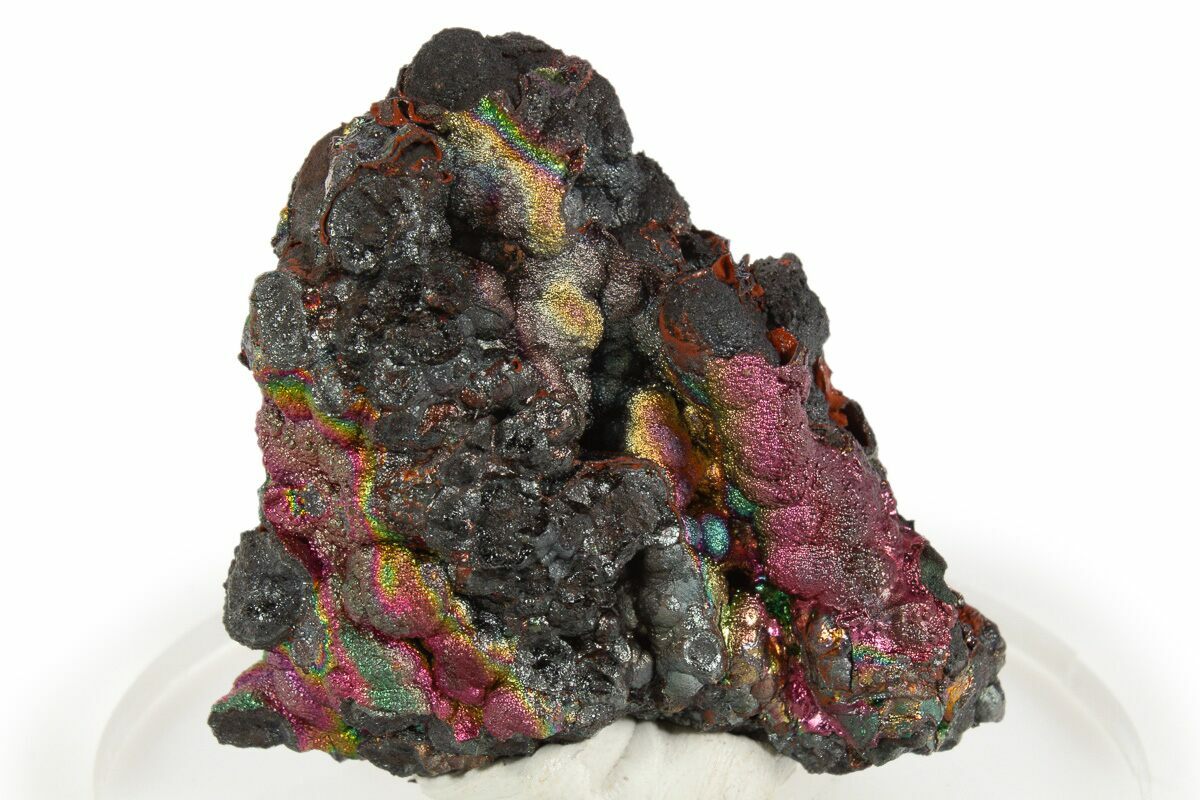 This attractive specimen exhibits bright pink-magenta, blue-green, and yellow-gold iridescence over portions of the goethite's surface. This stalactite formation presents in exceptionally bubbly botryoidal formations. It was collected from the Filón Sur open pit in Andalusia, Spain.