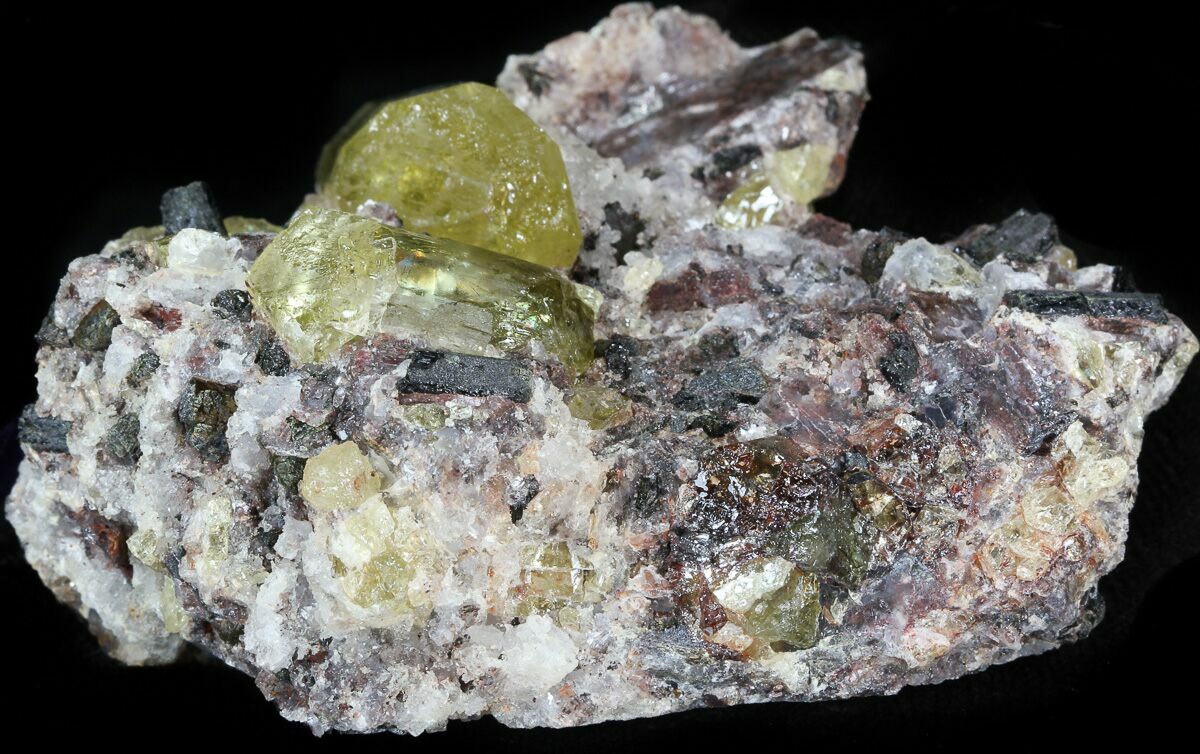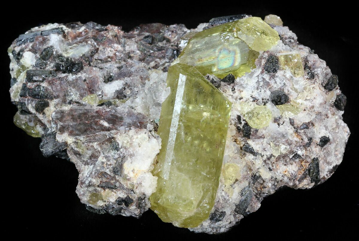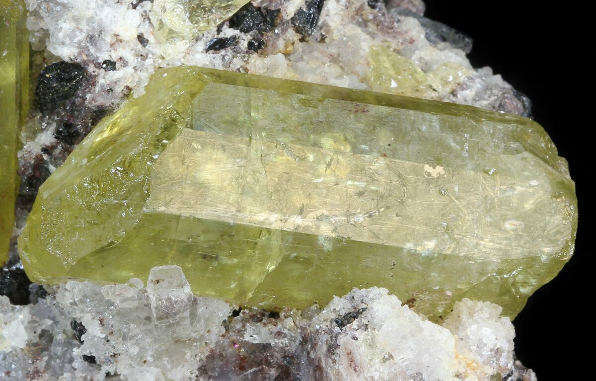 These are lustrous, lemon yellow, fluorapatite crystals still in matrix from Cerro del Mercado (Iron Mountain) at Durango, Mexico. One huge transparent crystal can be found exposed from its matrix, on what could be considered the top of the specimen. A smaller 1.10" crystal is located directly next to the larger specimen, with smaller crystals located throughout the matrix. Hematite, magnetite, and quartz can also be found associated in this rough matrix.