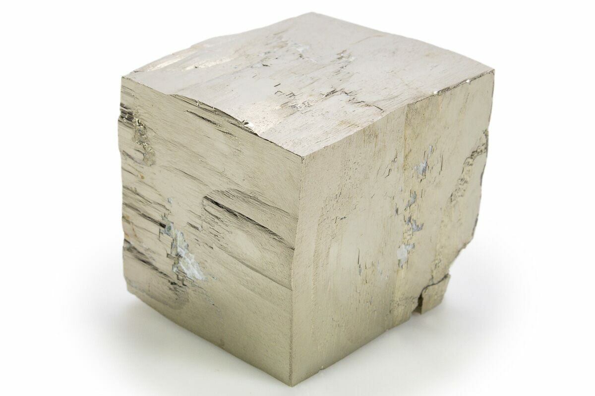 This is a large, 1.61" wide lustrous natural pyrite cube from the famous Victoria Mine in Navajun, Spain. It was carefully extracted from the rock it was found in using mechanical tools. There is some damage along the edges of the crystal.