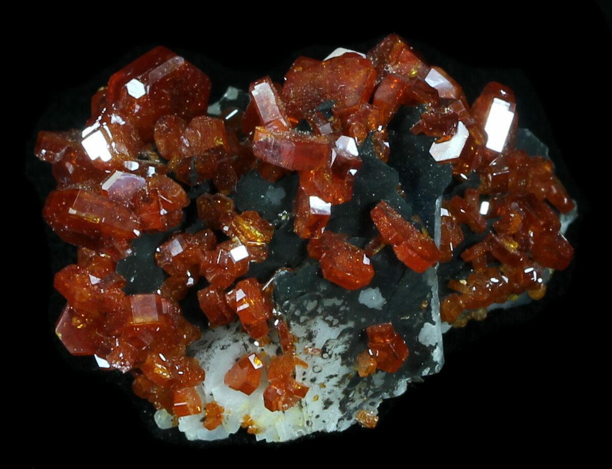This is a beautiful grouping of deep red, vanadinite crystals from Midelt, Morocco. They exhibit excellent color saturation, and a mirror luster on a matrix of barite. This specimen has a cluster of good-sized, high quality crystals and measures 1.61x1.05"